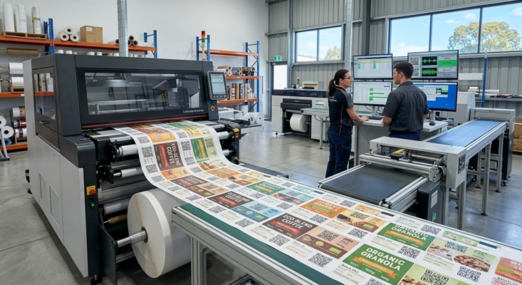 Cuối cùng, dữ liệu được truyền đến hệ thống máy in kỹ thuật số công nghiệp. Tại đây, máy in xử lý dữ liệu với tốc độ cao và in trực tiếp hàng loạt tem nhãn, trong đó mỗi tem đều mang một mã định danh riêng biệt. Toàn bộ quá trình diễn ra liên tục, chính xác và gần như không có sai số — ngay cả với khối lượng lớn.