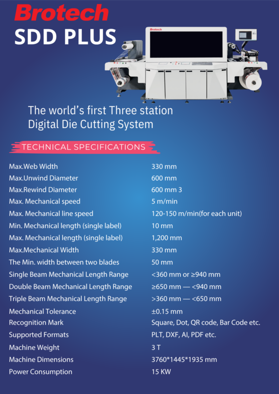 Trong quy trình hoàn thiện nhãn mác kỹ thuật số, Bro-tech SDD PLUS không chỉ là một chiếc máy bế, mà là hệ thống bế kỹ thuật số 3 trạm đầu tiên trên thế giới. Với sự kết hợp giữa trí tuệ nhân tạo (AI) và thiết kế đa trạm, SDD PLUS tái định nghĩa khái niệm về tốc độ và độ chính xác cho các đơn hàng nhãn dán kỹ thuật số hiện đại.
